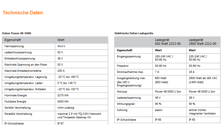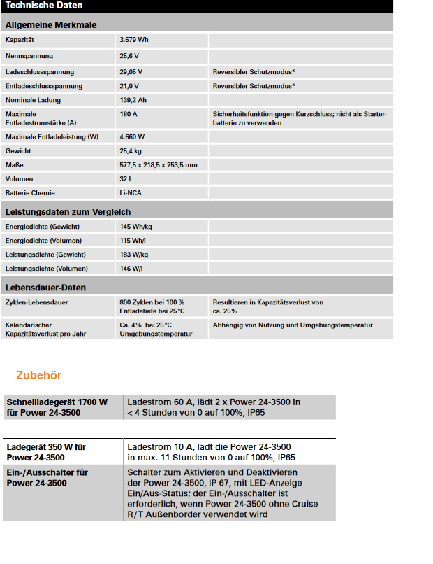 Die Lithium-Ionen-Batterie mit 3679 Wh Kapazität wird durch ein Batterie-Management-System mit integriertem Schutz gegen Überladung, Kurzschluss, Tiefentladung, Verpolung, Überhitzung und Untertauchengeschützt.